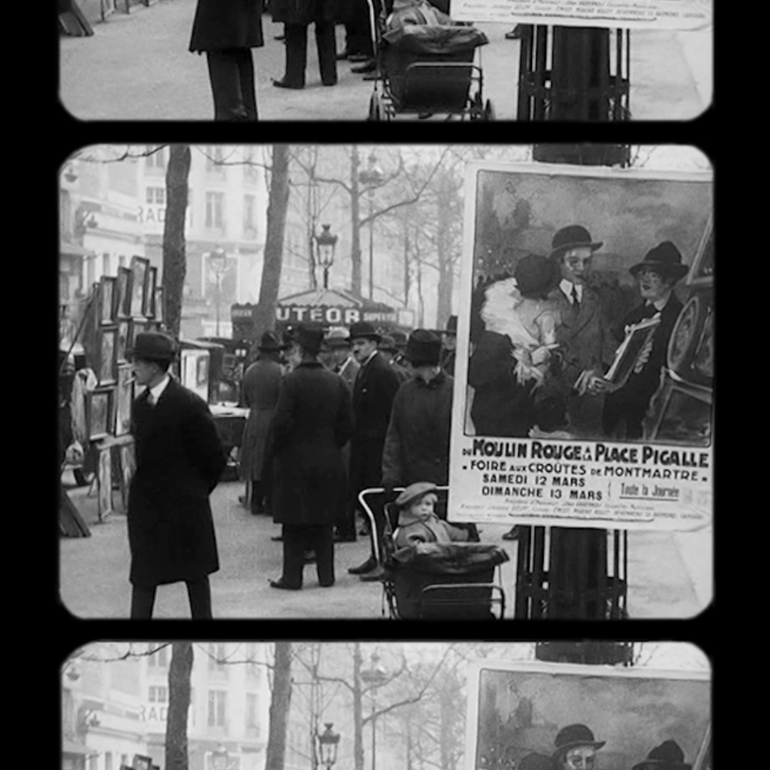C’est un film de 1927. Plus d’une minute de prises de vue à Paris, entre les tableaux et les passants. Ce film des Archives de la Planète de Camille Sauvageot s’intitule sobrement « Foire aux croûtes », en référence à l’exhibition des tableaux en plein air, dans le quartier de Montmartre en avril 1921. Thomas Clerc, avec son inénarrable recherche des lieux oubliés, perdus et entraperçus, entre ici dans les images et suit le parcours imaginaire d’un peintre de Montmartre ; poursuivant ainsi la déambulation inaugurée dans son dernier livre, Paris, musée du XXIe siècle.